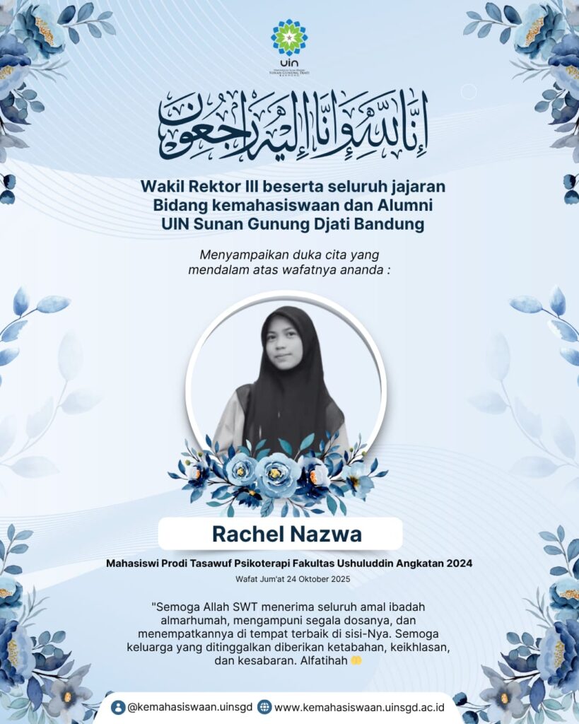 “Alharhumah Rachel Nazwa mahasiswa Jurusan Tasawuf dan Psikoterapi, Fakultas Ushuluddin angkatan 2024. Tadi malam almarhum telah dimakamkan di kampung halamannya,” kata Muhammad Helmi, Sabtu (25/10/2025).