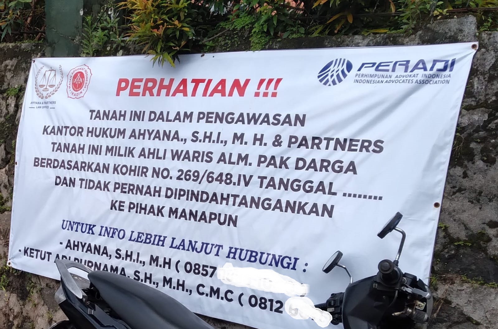 Di segel/spanduk itu tertulis, “Tanah ini dalam pengawasan kantor hukum Ahyana S.H.I, M.H & Partner. Tanah ini milik ahli waris alm. Pak Dirga berdasarkan kohir no 269/648.IV tanggal…dan tak pernah dipindah tangan ke pihak manapun”.