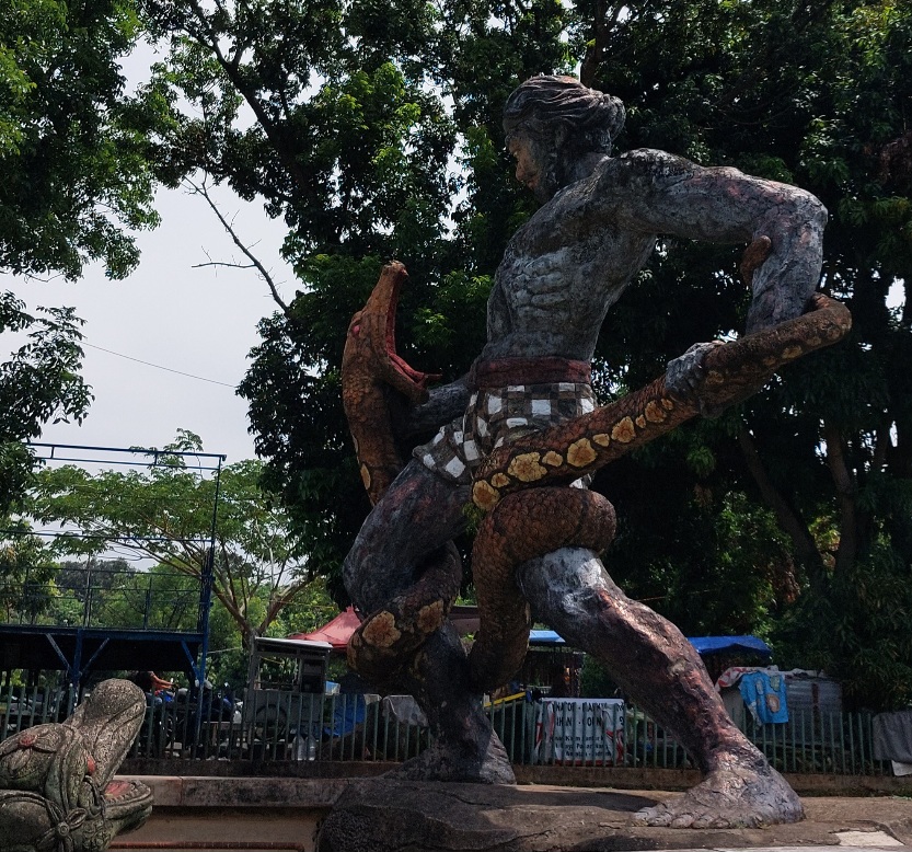 Patung Bima yang dililit dua kepala Ular di atas kolam itu menggambarkan kisah pertarungan antara Bima melawan Ular di atas laut. Namun sayangnya tidak terawat lantaran kolamnya kering kerontang tak berair.