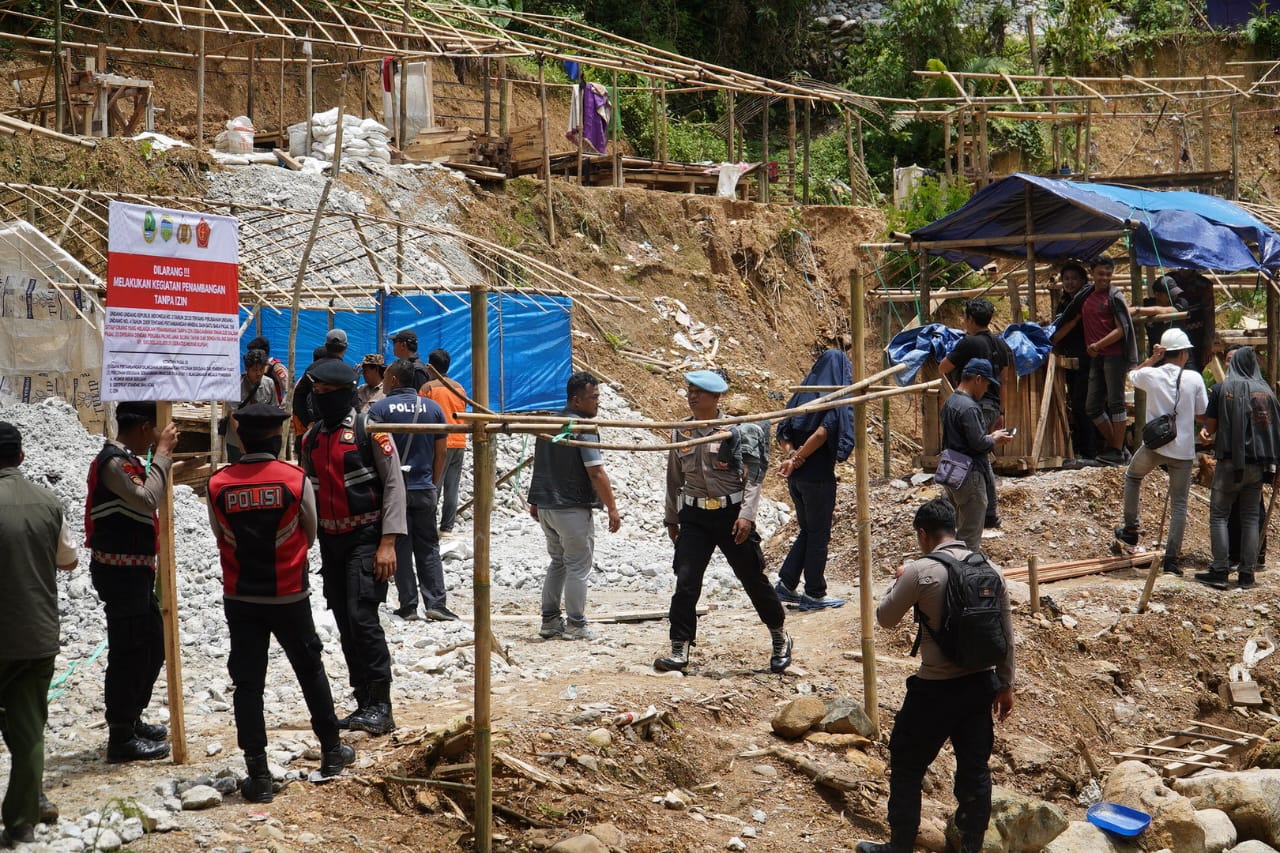 Selain memasang garis polisi, aparat juga terlihat mengambil sampel air limbah pengolahan emas yang diduga dialirkan langsung ke sungai di area tambang yang mirip seperti sumur, yang diduga digunakan untuk mengolah lumpur atau batuan yang mengandung emas.