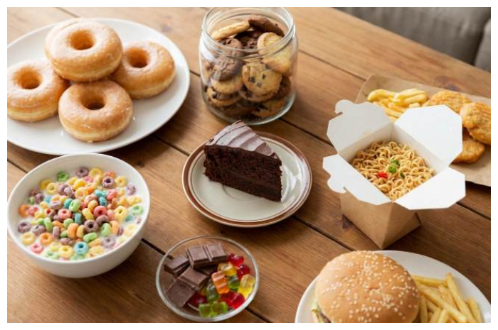 Berbagai makanan yang tergolong tinggi gula antara lain camilan manis seperti donat, kue, biskuit, permen, dan wafer yang umumnya rendah serat sehingga tidak memberi rasa kenyang lama.